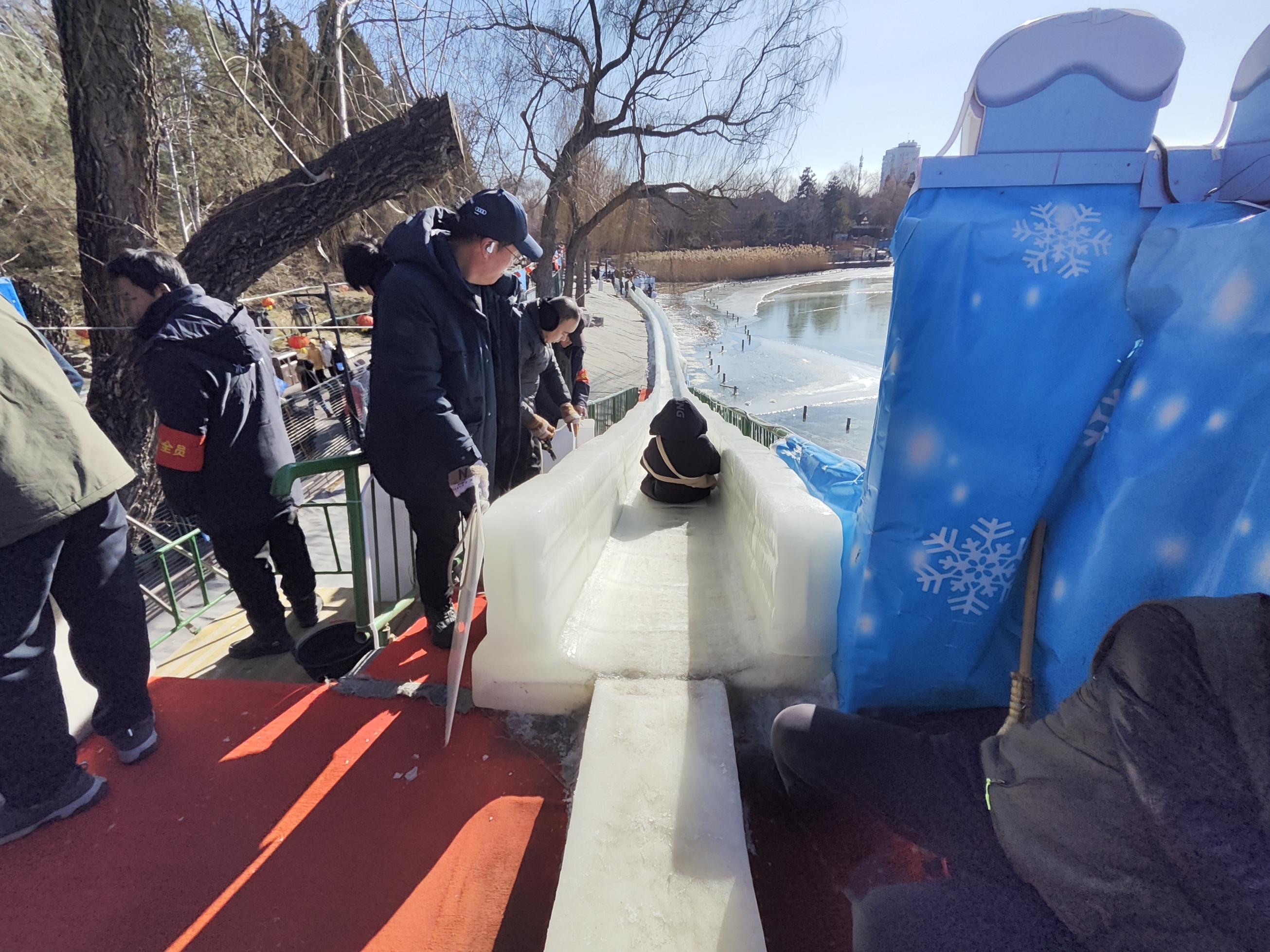 据现场工作人员介绍,近十年来每年都会搭建的冰滑梯在这个冬天“爆”了,网络上的热度很快转化为了线下的排队长度。高峰时排队的队伍长度能超过200米,春节期间许多来京的游客甚至将这里设为了冬日北京游的必打卡点之一。来京旅游的刘女士和她男友来自安徽,他们便将这次冰滑梯体验早早写在了旅行计划单上,趁着中午人不多,每人滑了两次还意犹未尽。刘女士说:“刺激程度刚刚好,10元一次真的很有性价比。”