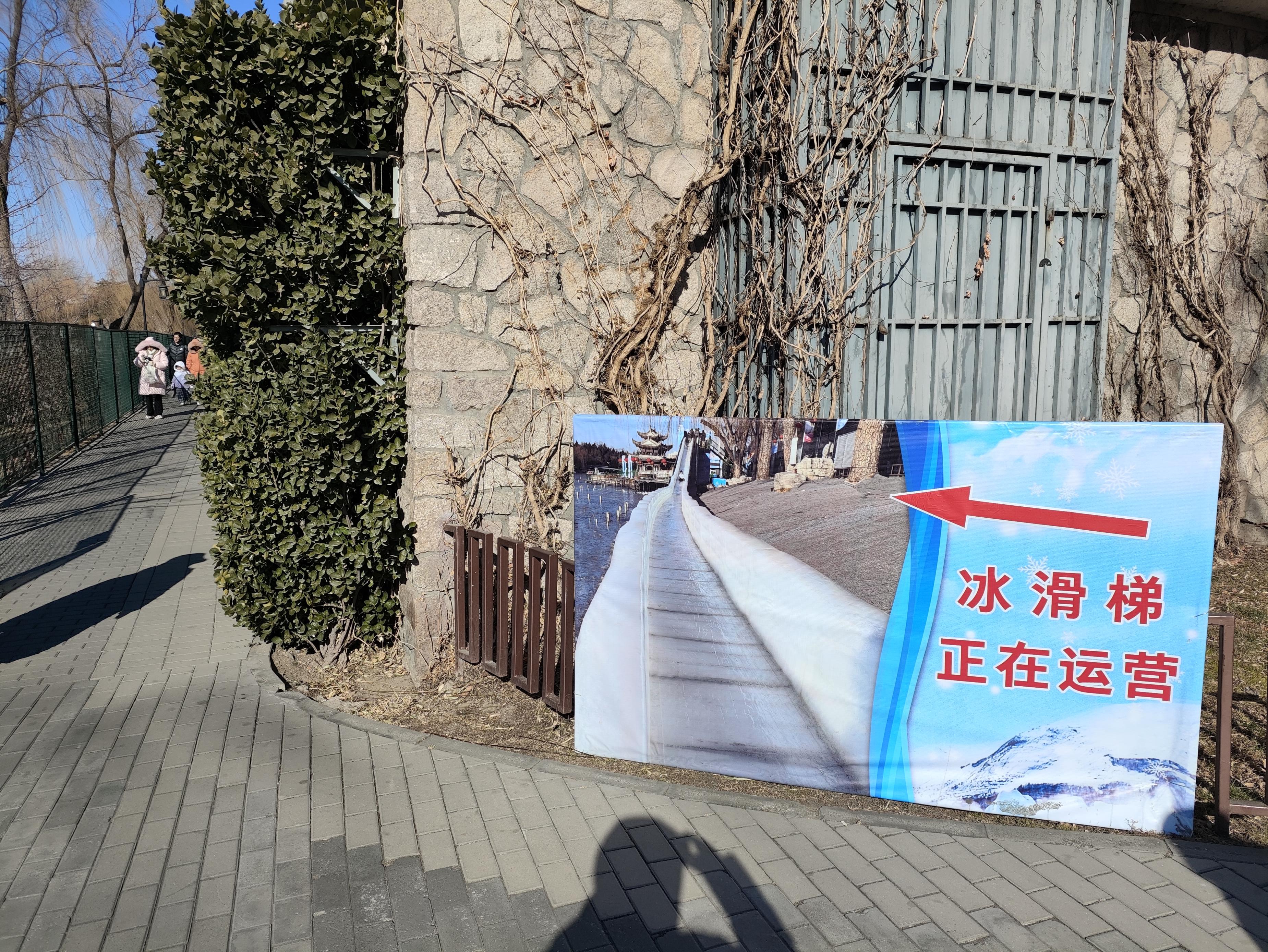 下午1点,从陶然亭公园南门进入,通过云庵桥或玉虹桥走到湖心岛上,就能看到“冰滑梯正在运营”的指示牌,湖心岛西侧就是冰滑梯的所在地。中午时分,80米长的冰滑梯前排起了近百米长的队伍,平均等候时间在20分钟左右。